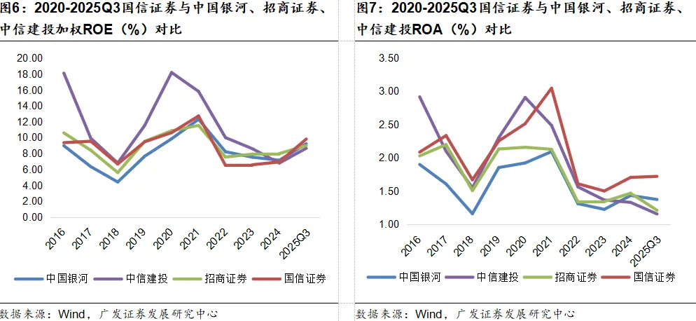 2016-2025Q3期间,国信证券与可比券商的ROE均随市场周期波动,差异集中体现在ROA的表现上,国信的高ROA特点在波动中持续展现相对优势。2021年国信ROA升至3.04%,为同期中国银河、招商证券、中信建投中的最高水平;2025Q3其ROA达1.72%,即便在行业盈利承压阶段,仍显著高于可比券商的平均水平,印证国信在资产端具备更强的盈利能力,这一优势源于其稳健的资产运营效率与业务结构适配性。依托资产运营能力的积累,随着资本市场活跃度提升及自身业务结构优化,国信证券ROA的相对优势预计能够延续,为ROE的持续改善提供坚实支撑,进一步巩固盈利韧性,ROE有望进一步走高,行业排名预期稳中有进。