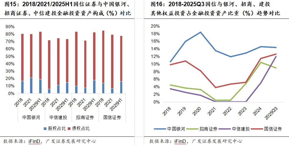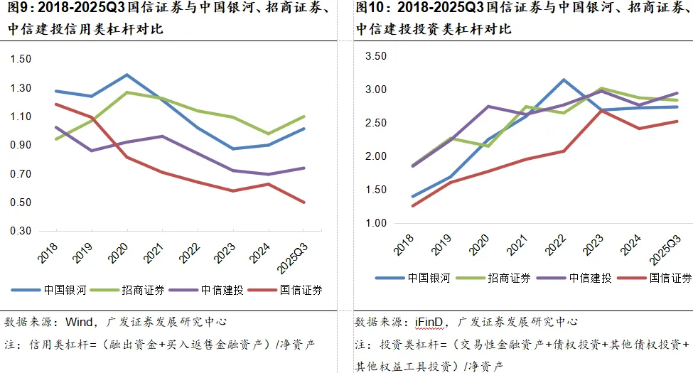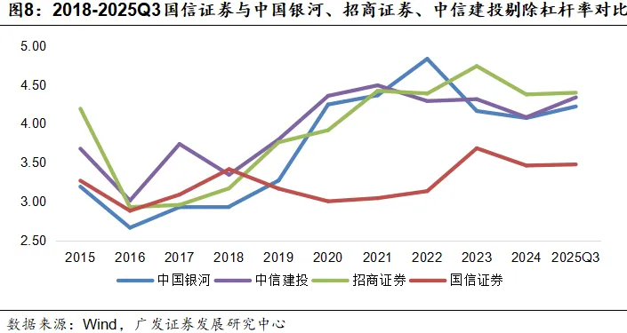国信证券的剔除杠杆率长期低于同梯队券商,始终保持稳健的杠杆策略。2025Q3其剔除杠杆率仅为3.48,这种低杠杆布局并非保守收缩,而是在风险可控前提下的理性选择,避免了高杠杆带来的业绩波动风险,是信用类与投资类杠杆双端共同保持审慎的结果。