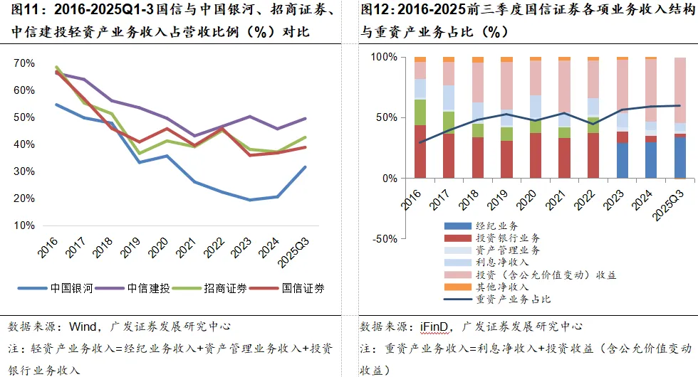 国信证券的高ROA并非单一因素所致,而是投资杠杆温和抬升、重资产业务收益释放、轻资产业务稳健托底的协同结果。投资杠杆的适度提升支撑了交易性金融资产等重资产业务的规模扩容,而轻资产与重资产的结构平衡,又降低了盈利波动,共同夯实了资产端的盈利效率。