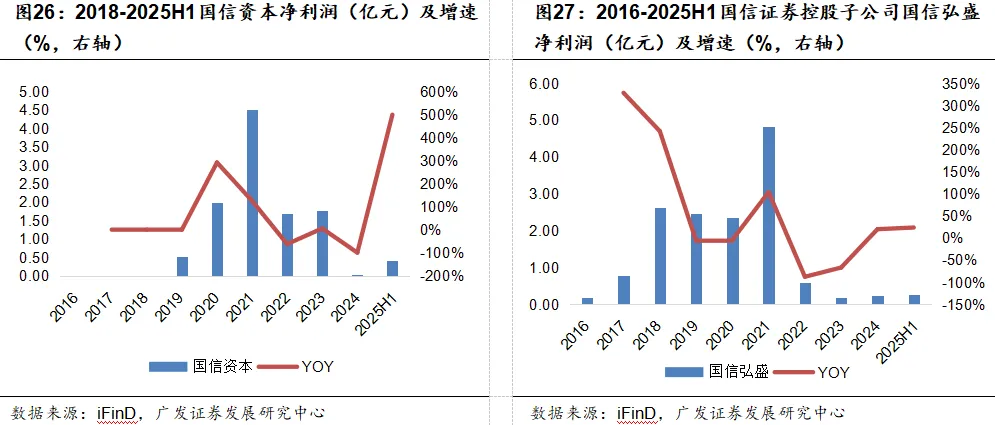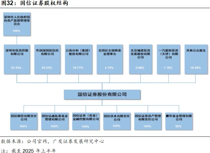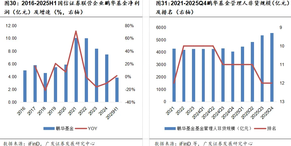公司通过持股50%的联营鹏华基金聚焦二级市场,开展公募基金管理业务,净利润长期保持稳健,截至2025年6月末,鹏华基金资产管理规模12,514亿元(不含子公司),其中公募管理规模9,500亿,较年初增长4%。其非货管理规模持续扩容,对应行业排名长期处于10-12名区间,整体稳居行业第一梯队。