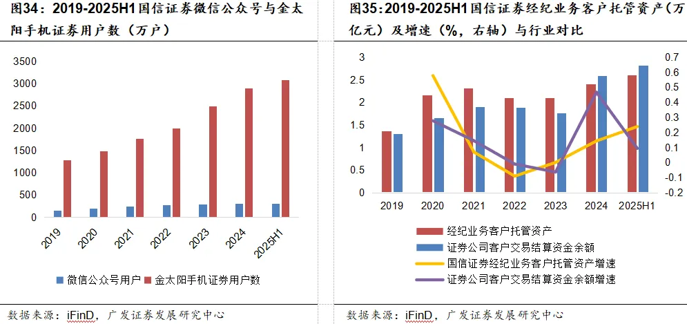 托管资产规模高增。国信证券经纪业务客户托管资产突破2.6万亿元,增速节奏显著优于行业,体现了客户粘性与资产留存能力的双重优势。其增速在行业波动中更具韧性,既借市场景气实现高增,又在调整期稳住节奏,彰显财富管理转型的实效。展望未来,伴随线上用户粘性提升与全链条服务深化,资产沉淀效应将持续强化,进一步巩固客户与规模优势,为财富管理业务增长筑牢坚实基础。
