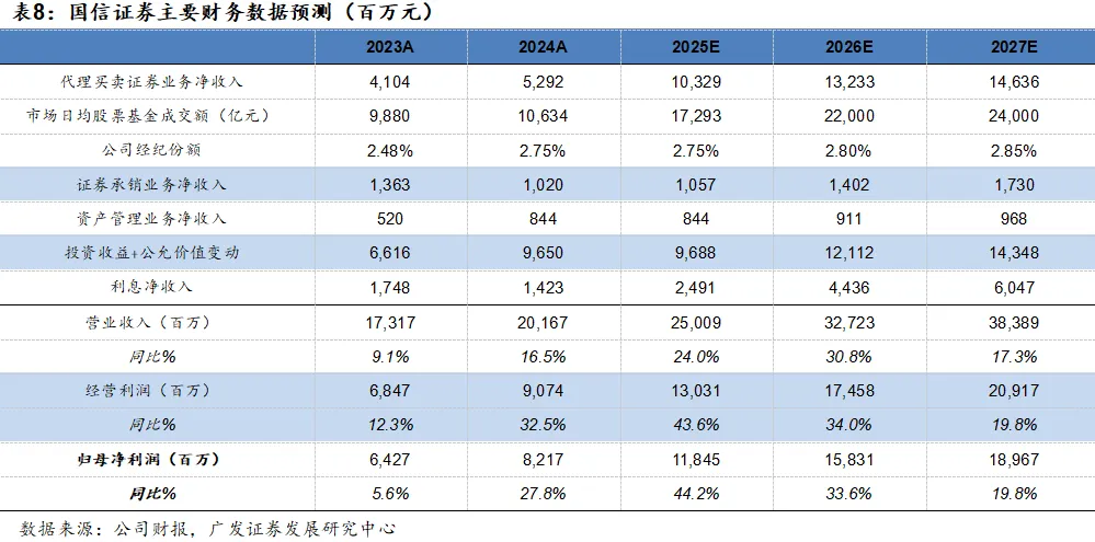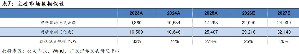 国信证券财富管理业务作为营收“压舱石”,依托科技赋能、线上导流线下深耕的战略,转型成效显著且韧性强。从市场环境看, 2023年市场日均成交额为9880亿元,2024年增至10634亿元;从公司市占率看,2023年国信证券股基交易额市占率为2.48%,2024年提升至2.75%,两年间市占率稳步提升,2026年增量资金加速入市,政策环境整体向好,预期全市场日均成交额将从2025年的17293亿元增至2026年的22000亿元,同比增长27%;国信证券股基交易额市占率延续提升趋势,微增至2.80%上下。