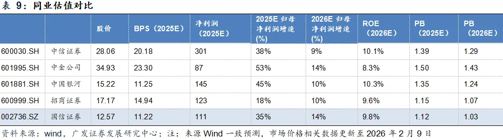 选取国内头部综合性证券公司中信证券、中金公司、中国银河、招商证券作为可比公司,业务布局覆盖投资交易、财富管理、投资银行等核心板块,与国信证券的业务结构具备匹配性;同时行业规模、资本实力处于相近梯队,能够形成有效估值对标。