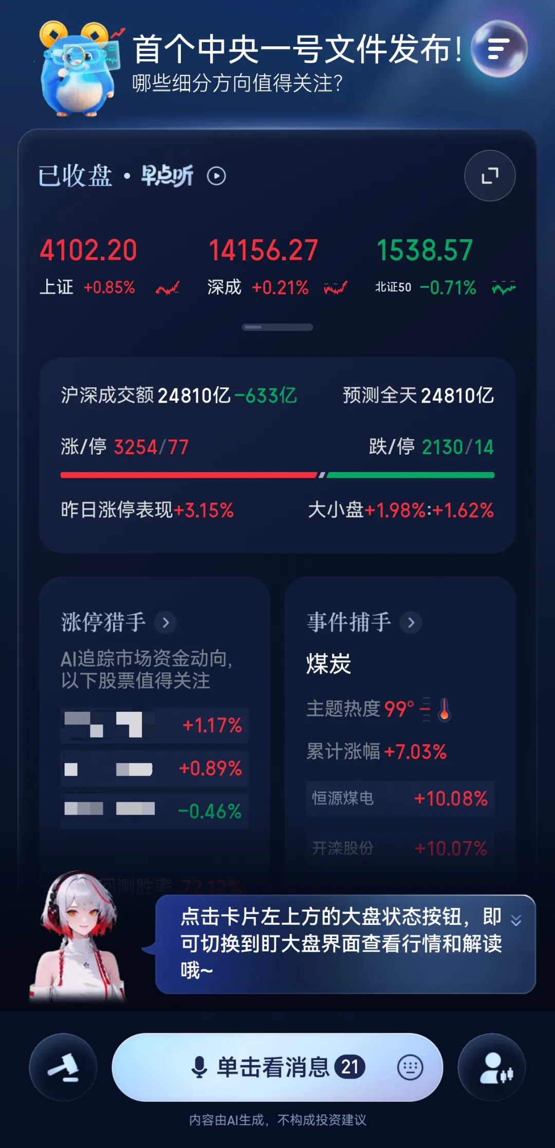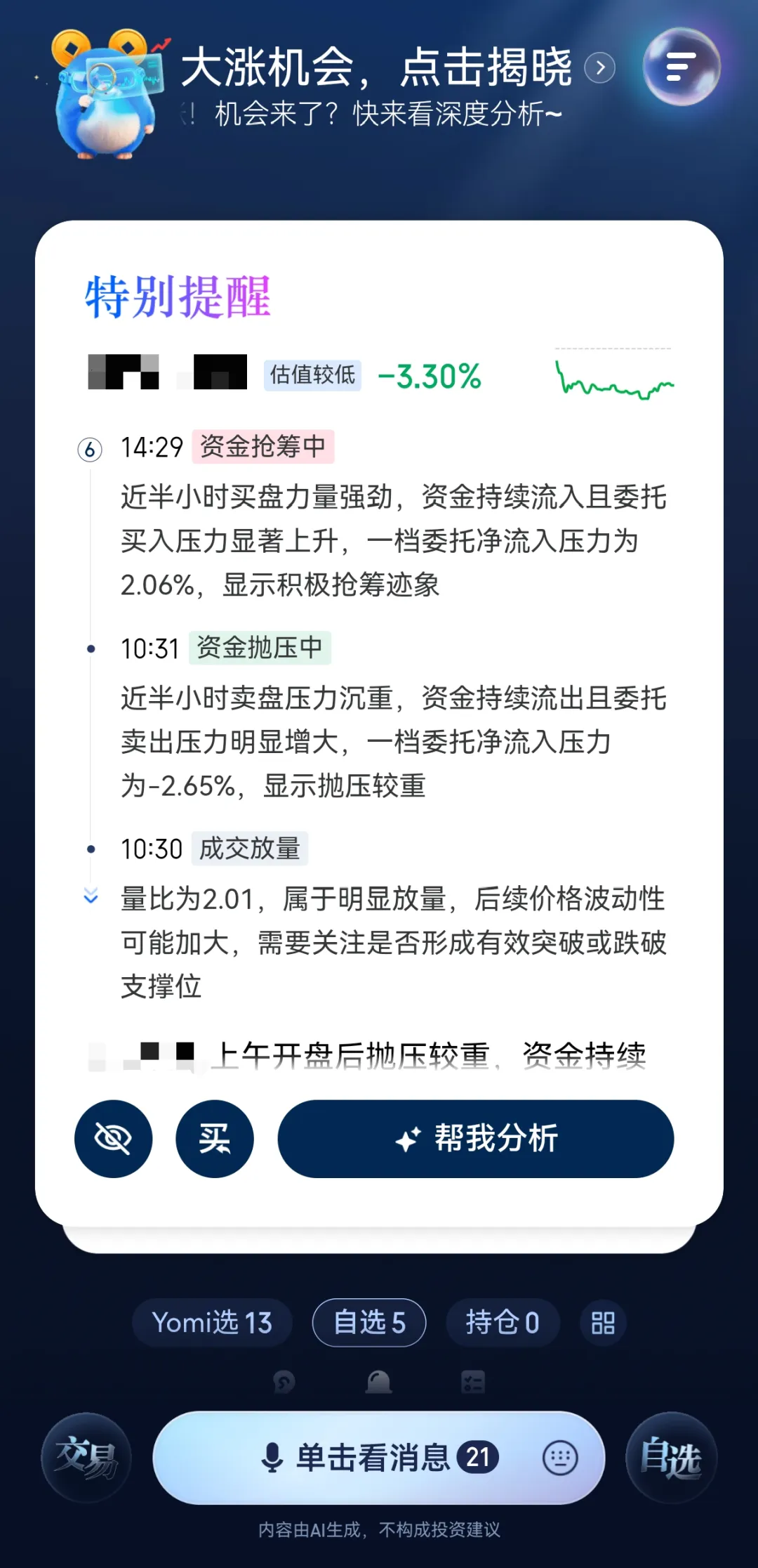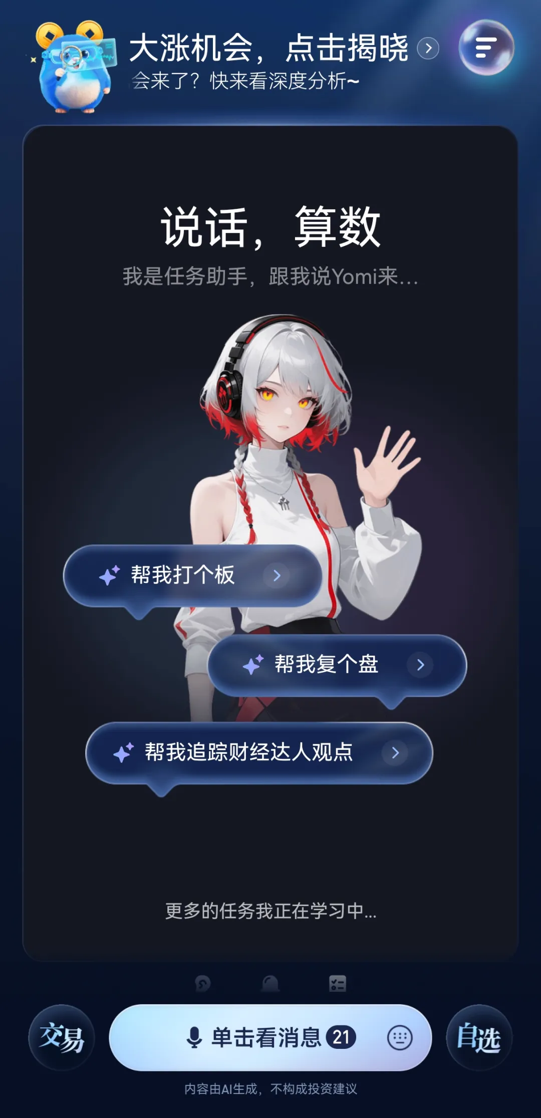 针对用户不清楚“买什么”的需求,“AI 涨乐”提供热点、连板、主题、资金四大维度的选股工具;针对用户纠结“何时买”的问题,AI 助手会基于事先设定的指标和条件帮用户盯盘,实时监测市场信息,有变化立刻提醒;在交易环节,只需要动动嘴传达语音指令,再手动确认后就能完成下单。