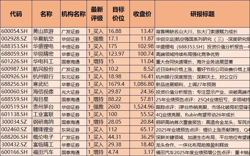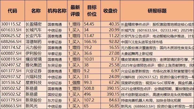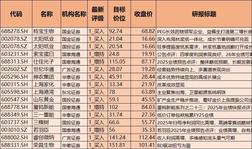 根据近半月券商研报整理,因为2025年业绩高成长或超预期,业务全球化加速,以及AI应用场景拓展等原因,相关个股被券商给于买入、强推、增持等高评级及目标价,涵盖医药、光模块、工程机械和半导体等。具体名单梳理如下: