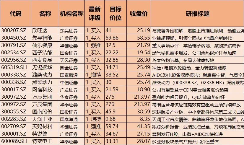 潍柴动力和万辰集团也均被多次评级。其中,潍柴动力被两家头部券商中信证券和国泰海通评级,万辰集团被华泰证券两次评级。