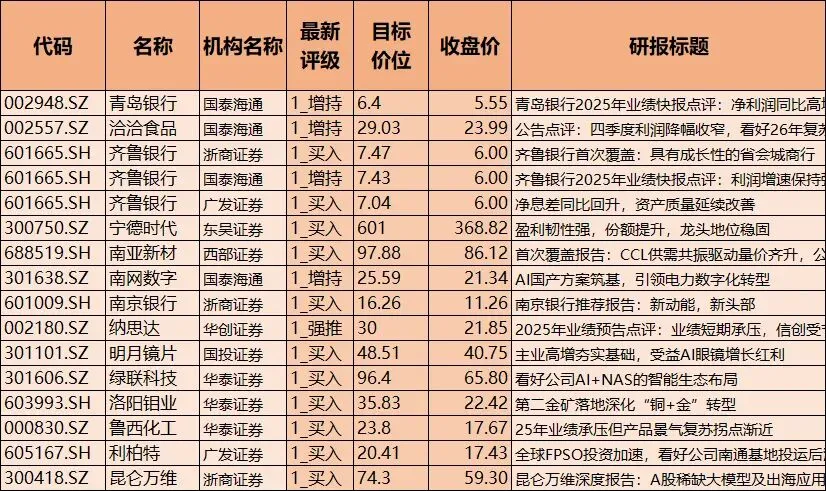 青岛银行的净利润同比高增22%,不良率降至1%以下,国泰海通评级为增持。另一家齐鲁银行,被三家机构评级,源于利润增速保持强劲,资产质量连续七年优化,净息差同比回升等原因,浙商证券,国泰海通和广发证券给于的目标价分别为7.47元、7.43元和7.04元,而当前股价是6元。