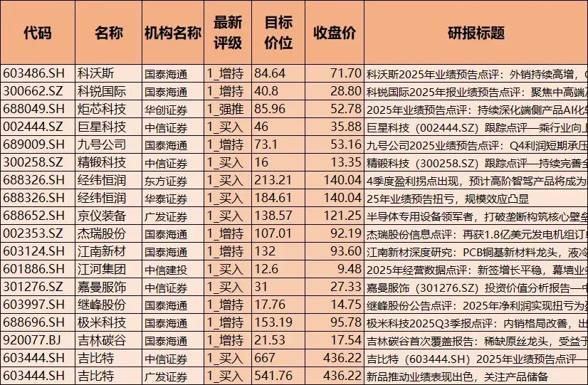 其他券商评级的股票,包含科沃斯,外销持续高增,国泰海通给于增持;科锐国际聚焦中高端及科技,业绩改善明显,国泰海通也给出增持;炬芯科技持续深化端侧产品AI化转型,盈利规模与质量双向进阶,华创证券评级为强推。