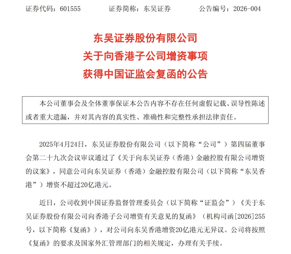 东吴证券增资境外子公司2月12日,东吴证券发布公告称,公司收到中国证监会《关于东吴证券股份有限公司向香港子公司增资有关意见的复函》,证监会对公司向东吴香港增资20亿港元无异议。该增资事项于2025年4月24日经东吴证券第四届董事会第二十九次会议审议通过,待国资监管部门批准后方可实施。公开信息显示,东吴香港是东吴证券全资境外子公司,于2016年6月27日在中国香港注册成立,注册资本为1亿港元。近年来,东吴证券多次增资东吴香港,加码国际业务。2018年,东吴证券对东吴香港进行增资,使其注册资本由1亿港元增至7亿港元。2020年5月,东吴证券向东吴香港增资4.8亿元人民币或等值港币。2025年,东吴证券进一步披露拟向东吴香港增资不超过20亿港元或等值人民币的计划。2019年6月,东吴香港以4.79亿港元收购中投香港100%股权,获得全牌照业务资格。