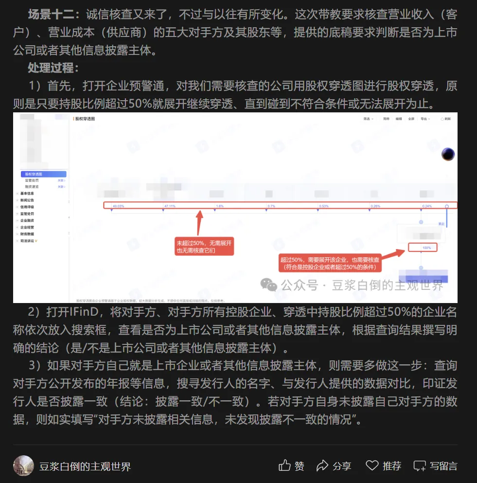 遇见既是供应商也是客户的企业,需要说明原因。经验丰富的发行人一般会自己乖乖写好放在募集上,找不到的话就问问带教、让他们去和发行人沟通。 对于未收集到合同的前五大对手方,可以进行替代核查。这个也需要问问带教,我看到的方法是寻找其他的公开资料作为佐证。还需要撰写替代核查的原因,比如“占比较小、因此判断不存在严重依赖等”。 需要说明对于集中度高的客户、获取了最多的合同金额。 对于披露了前五大主要客户、销售商的业务,需要撰写项目组核查③对诚信情况进行核查。详见本公众号发的“券商债承实习 | 一些杂活自己总结的SOP(2)”的“场景十二”、“券商债承实习 | 诚信核查专题:没做过诚信核查的债承实习,是不完整的”。