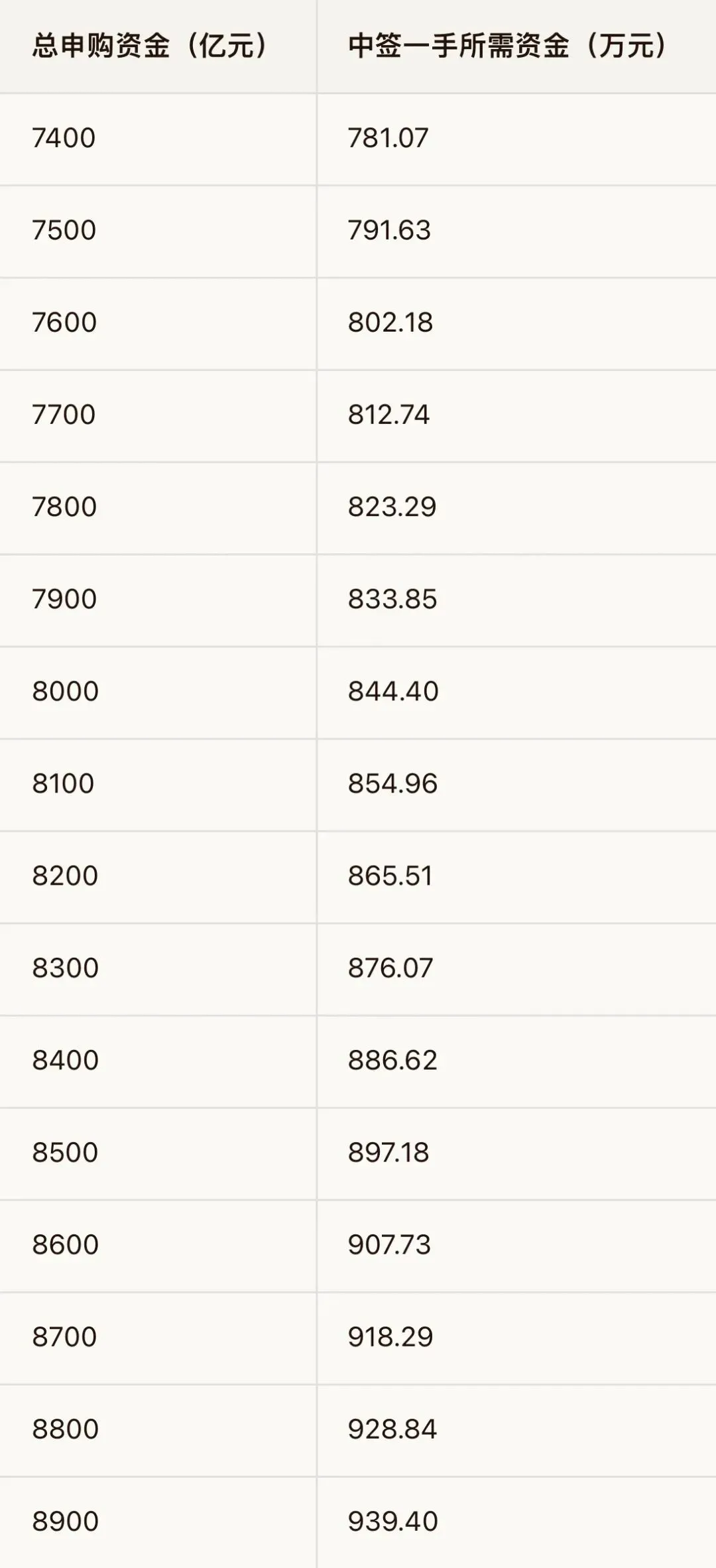 基于以上考虑,本次申购资金约8100亿。整股手数约6.8万
