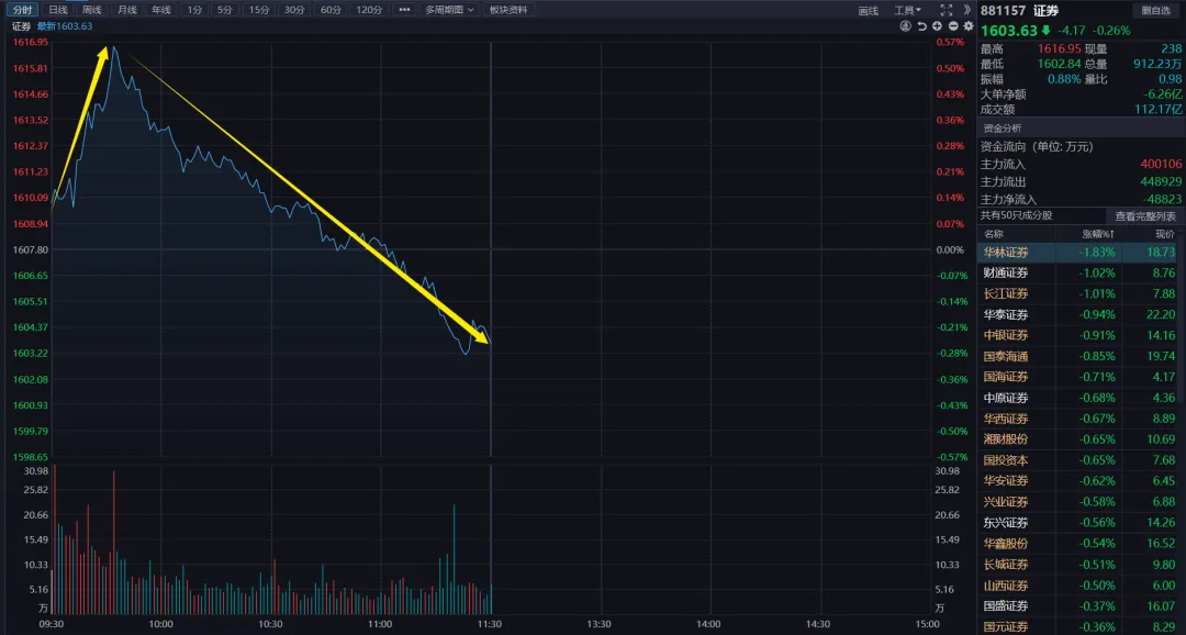 早盘在昨夜美股大跌的情况下,咱们也跟着低开了20个指数点,随后在券商的带领下,走出了低开高走的局面。操盘手见情绪稳定后,马上就把工具人放下了: