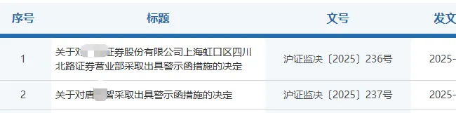 2025年12月,上海局连续发布2份处罚决定,对证券从业人员唐某智及其所在证券营业部分别采取出具警示函的行政监管措施。