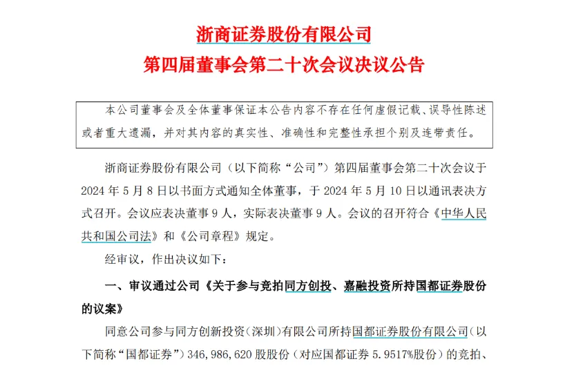 这已经是浙商证券在短短几天之内,第二天召开董事会,决定参与国都证券的股权竞拍了。
