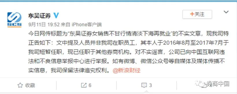 影响有多大?东吴证券深受困扰,官方微博昨晚近八点时进行了辟谣,称下海再就业的女销售在去年7月份之前在东吴证券短暂任职,现已任职于其他券商机构。翻译一下就是,“这个锅另有主人呀,别扣在我头上。”