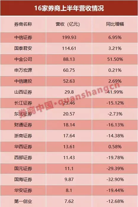 就目前发布的16家上市券商半年报来看,仅有中金公司、中信证券和申万宏源证券三家券商归属于母公司的净利润实现正增长。
