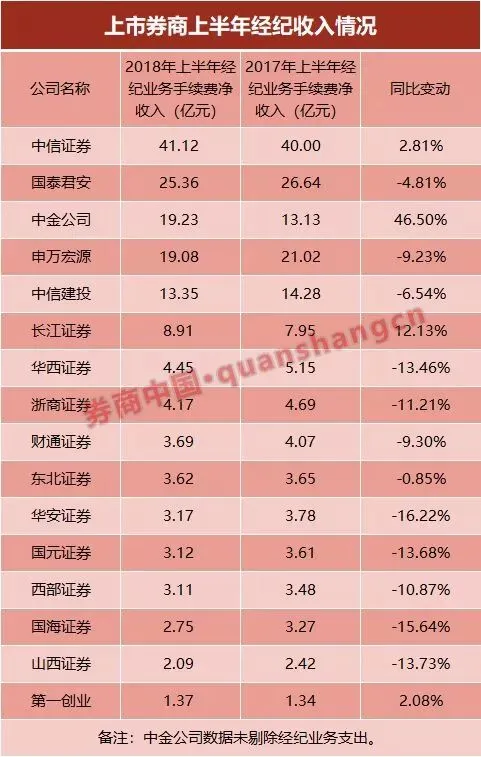 上半年,受两市股票日均交易额逐年下滑以及继续走低的佣金率影响,券商经纪业务收入普遍下滑。
