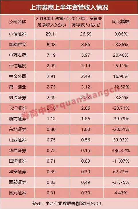 就目前公布半年报的16家上市券商中,有7家券商资管收入同比增长,9家券商资管收入下滑。其中,由于基数较少,华西证券资管收入的同比增幅均超过100%。