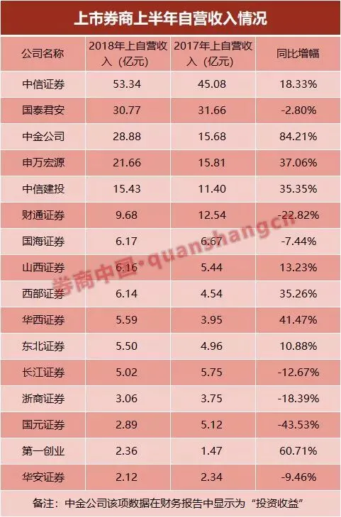 中信证券上半年自营收入为53.34亿元,较去年同期增加了18.33%。中信证券在半年报中表示,2018年上半年,公司股票自营业务根据市场变化,强化了仓位管理,严格管理市场风险,将市场波动带来的风险尽量控制在较低范围。加强研究体系建设及基本面研究力度,继续探索多策略的自营模式。