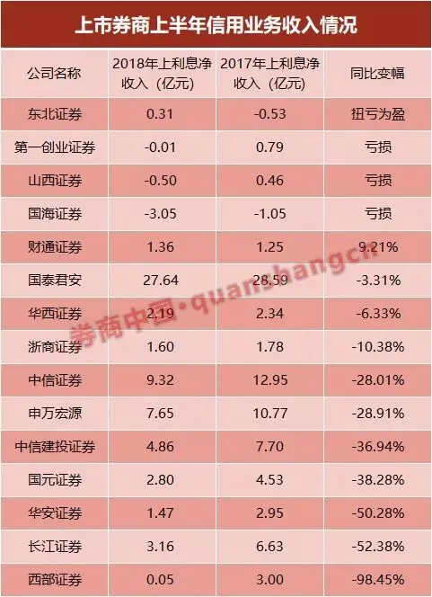 从指标来看,利息净收入大部分来源于股票质押等信用类业务。上半年各券商利息净收入除财通证券有所增长、东北证券扭亏为盈外,均出现下滑,还有第一创业证券、山西证券、国海证券3家券商出现亏损。
