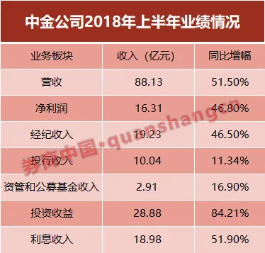 2018年上半年,中金收入和盈利较去年同期有显著增长,实现收入及其他收益总额人民币88.13亿元,同比增长51.5%;净利润为人民币16.31亿元,同比增长46.8%。据其未经审计的财务报告,上半年经纪收入、投行收入、资管和公募基金收入、投资收益、利息收入等各主营业务板块收入均有大幅增长。