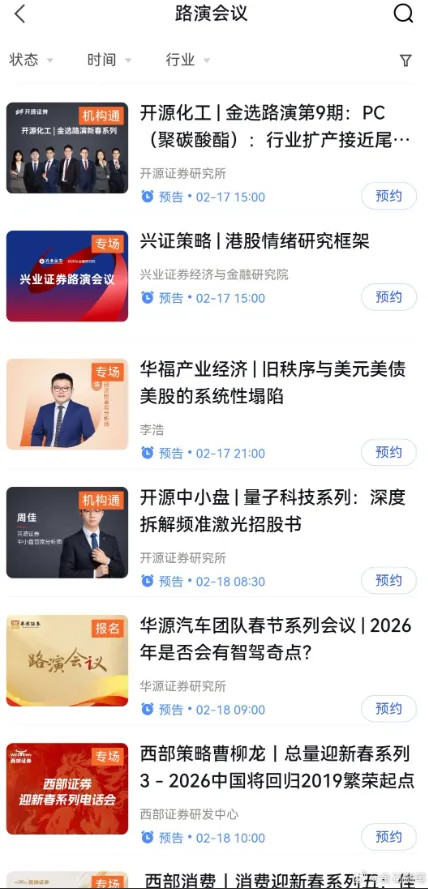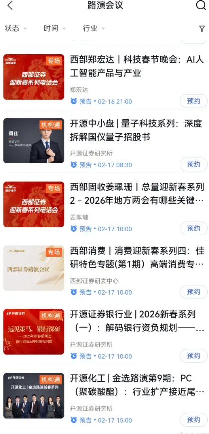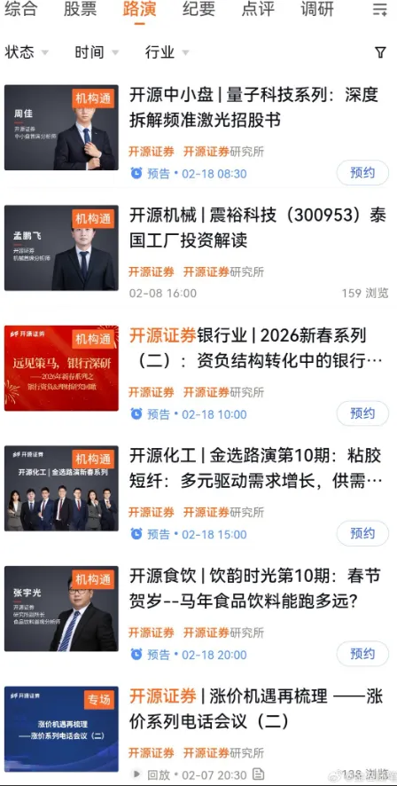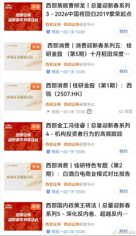 太卷了!有券商除夕晚上、大年初一就开始路演了,甚至8天不打烊2月13日消息,春节9天长假即将来袭。不过,就在这春节假期档口,券商们又开始疯狂内卷了。在社区平台,一张截图刷屏:春节8天不打烊,研究相伴不停歇!2月16日至2月23日,某证券总量团队8天连播,为您前瞻市场主线。对此,网友评论:平时卷也就算了,某家券商这怎么把过年期间除夕到初七8天的假期排上了路演,真的太卷了,能不能一起愉快的过个好年。金石杂谈查询某知名路演平台,在除夕大团圆的晚上,西部证券有路演,而在大年初一一大早,开源、西部,开源、西部,兴证、华福等纷纷有路演,西部开源各两场。至于这家将春节假期排满的券商,应该是西部证券,属实是从春节晚上到初七假期结束都安排的满满当当。而开源证券也是不遑多让,每天都有两三场路演,同样从初一到初七都有路演。不过,开源,除夕给分析师们放了个假。金石杂谈查询发现,前三季度,西部证券实现收入43.35亿,同比下滑2.17%,但利润12.43亿,同比增长70.63%;第三季度业绩更是爆发式增长。不过,就近四年上半年研究所收入来看,可谓持续下滑,22年中期过亿,23年中期尚有7000多万,24年中期腰斩,25年中期只剩下2714万。降薪裁员、分析师跳槽、公司内卷或是研究所收入下滑的真实写照。开源证券则更加典型,连续三年研究所半年收入过亿,如今25年上半年只有不到6000万,近乎腰斩。