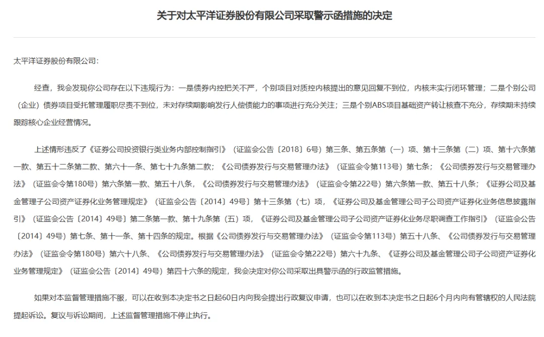 根据证监会官网信息显示,财通证券、中天国富和太平洋证券因为债券内控等方面的问题,被证监会采取警示函措施。