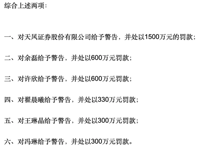 其中,天风证券时任董事长余磊、时任副总裁兼财务总监许欣不仅分别被处以600万元的高额罚款,更被采取终身证券市场禁入措施。同时被终身禁入的还有当代集团实际控制人艾路明。此外,时任董事兼总裁王琳晶、时任常务副总裁冯琳、时任副总裁翟晨曦等人也分别被处以300万元至330万元不等的罚款