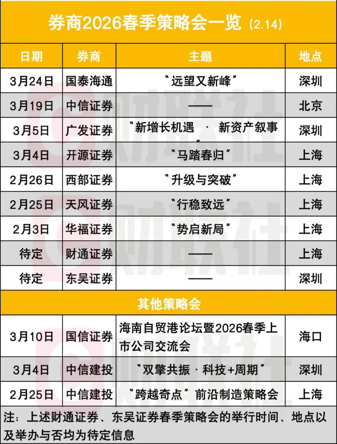 记者获悉,截至2月15日,已有包括国泰海通、中信证券、广发证券、开源证券、西部证券、天风证券、华福证券在内的7家券商,先后确定举办2026年春季策略会。其中,华福证券已率先于2月3日打响春季策略会的“第一枪”。