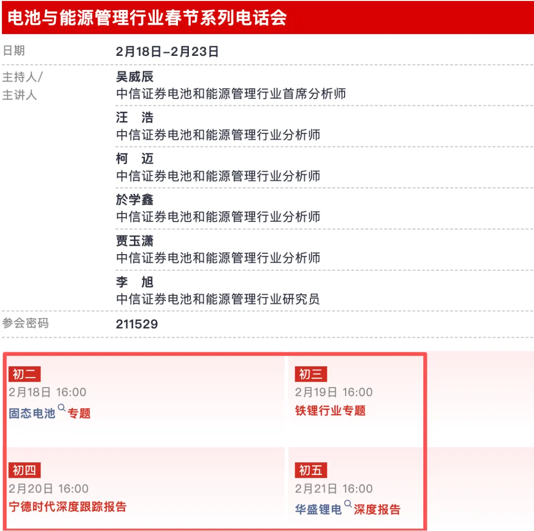 中信证券研究官方公号显示,中信证券2026马年新春系列电话会举办时间覆盖正月初二(2月18日)到初九(2月25日),涉及的行业研究包括电池与能源管理行业、通信行业、计算机行业大模型、互联网行业等7大行业或板块,单场系列会举办时间在4天到6天不等。
