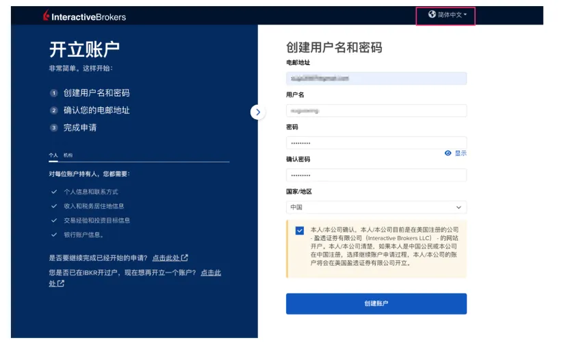 开户页面默认是英文,可在右上角切换为"简体中文"。