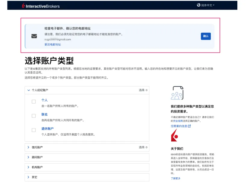 点击"创建账户"后,进入"邮箱确认"和"选择账户类型"页面。