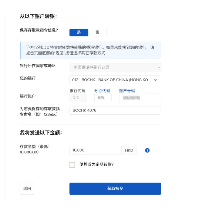 输入你的香港卡的信息和入金金额。