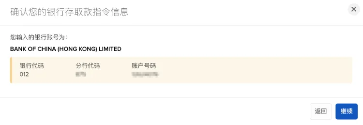确认银行账号信息,点击"继续"。