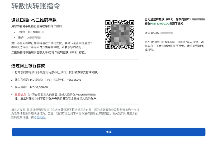 使用香港银行卡转账成功后,点击"完成",等待盈透的进一步消息。
