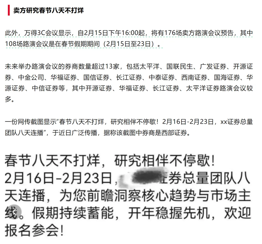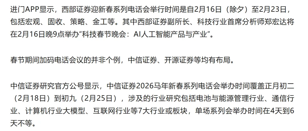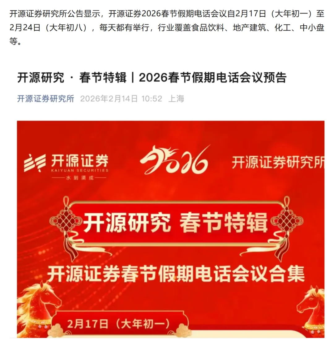 大瓜!券商春节期间组织了300场电话会议作为最卷的行业券商春节依然不打烊,组织了近300场电话会议等着你进门APP数据显示,2月16日至23日,券商研究所将在春节假期期间举办292场电话会议,日均超32场,其中除夕7场、大年初一10场。还有开源证券,大年初一到初八不休息。。。。。