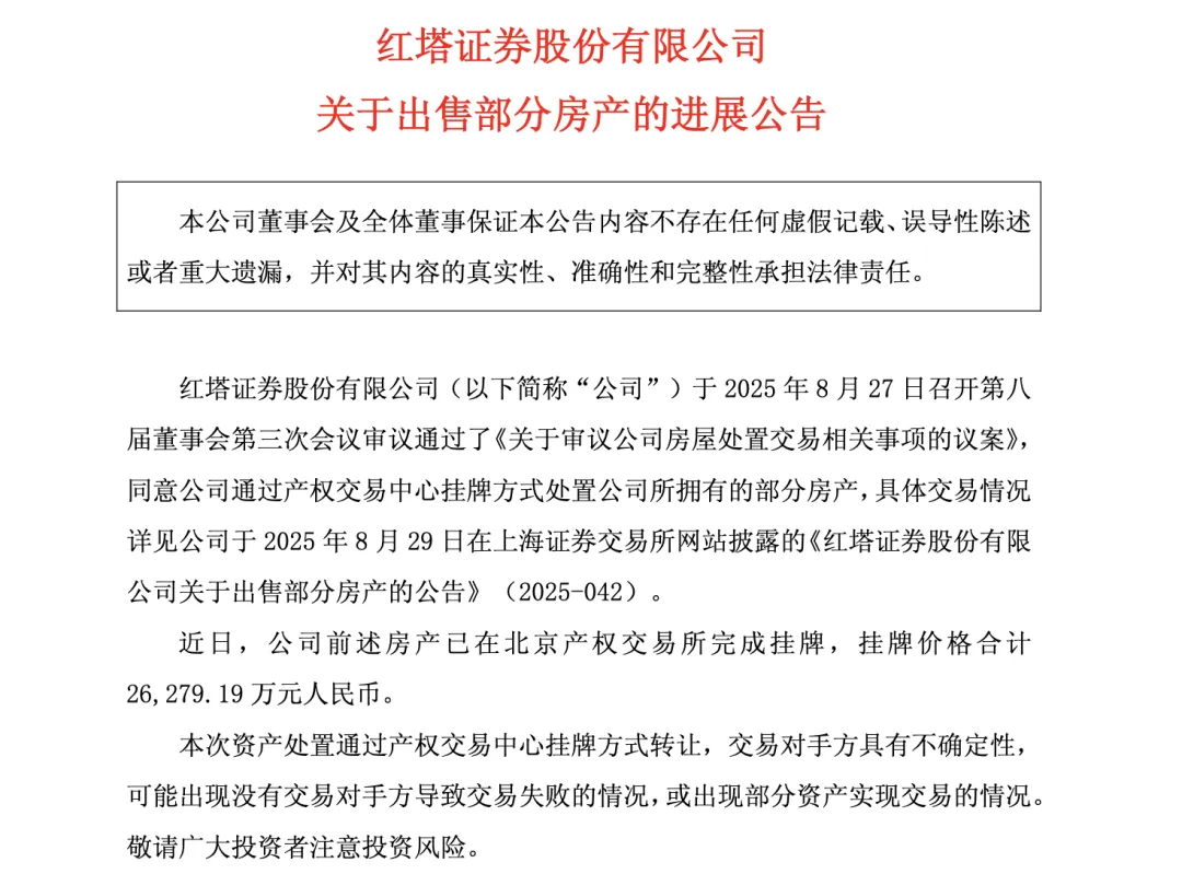 尽管前景可观,但红塔证券此次房产处置仍存在变数。公司在公告中明确提示风险:本次资产处置通过产权交易中心挂牌方式转让,交易对手方具有不确定性,可能出现没有交易对手方导致交易失败的情况,或出现部分资产实现交易的情况。