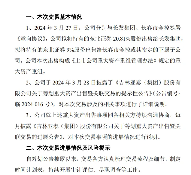 截至公告披露日,亚泰集团正与各相关方就本次股权出售事项持续沟通协商,积极推进保留意见相关事项的整改与确认、受让方股东资格的沟通等工作,并将严格按照相关法律法规及公司章程的规定,及时履行信息披露义务,向市场通报交易进展情况。