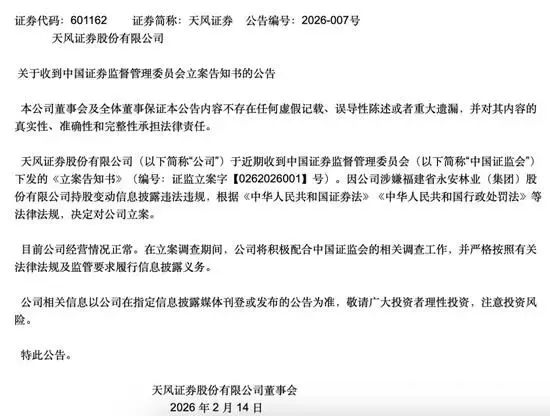 2026年2月13日,天风证券股份有限公司(以下简称“天风证券”或“公司”)发布公告称,公司收到湖北证监局下发的《行政处罚事先告知书》(鄂处罚字[2026]7号),因涉嫌信息披露违法违规、违法为股东及关联人提供融资两大核心违规行为,天风证券及5名相关责任人合计被罚3630万元,其中两名核心责任人被采取终身市场禁入措施,这一案例彰显了监管部门强化证券行业合规监管、压实市场主体责任的坚定决心,也为全行业敲响了合规经营的警钟。