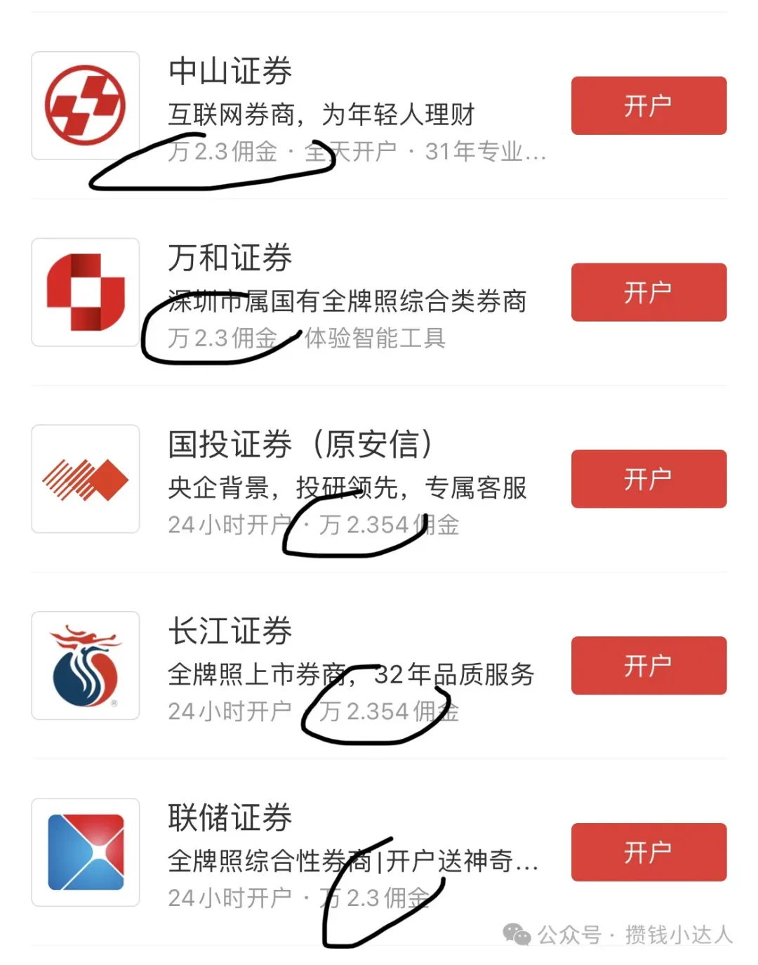 然后部分券商为了推广自身的开户业务,就会选择和一些财经大V合作,这个也就相当于咱们购物的时候拼多多团购更优惠,目前攒钱小达人合作的券商已经有几十家了,给我们的粉丝带来的团购优惠价万一免五,万一也就是交易一万元收取一块钱的手续费,免五就是免去起步的5元限制,这个活动力度可以说非常大了。有的粉丝朋友经常问一年能省下多少money¥,看下图