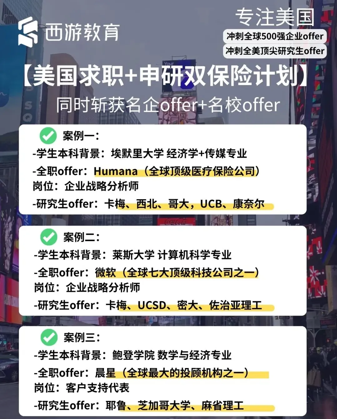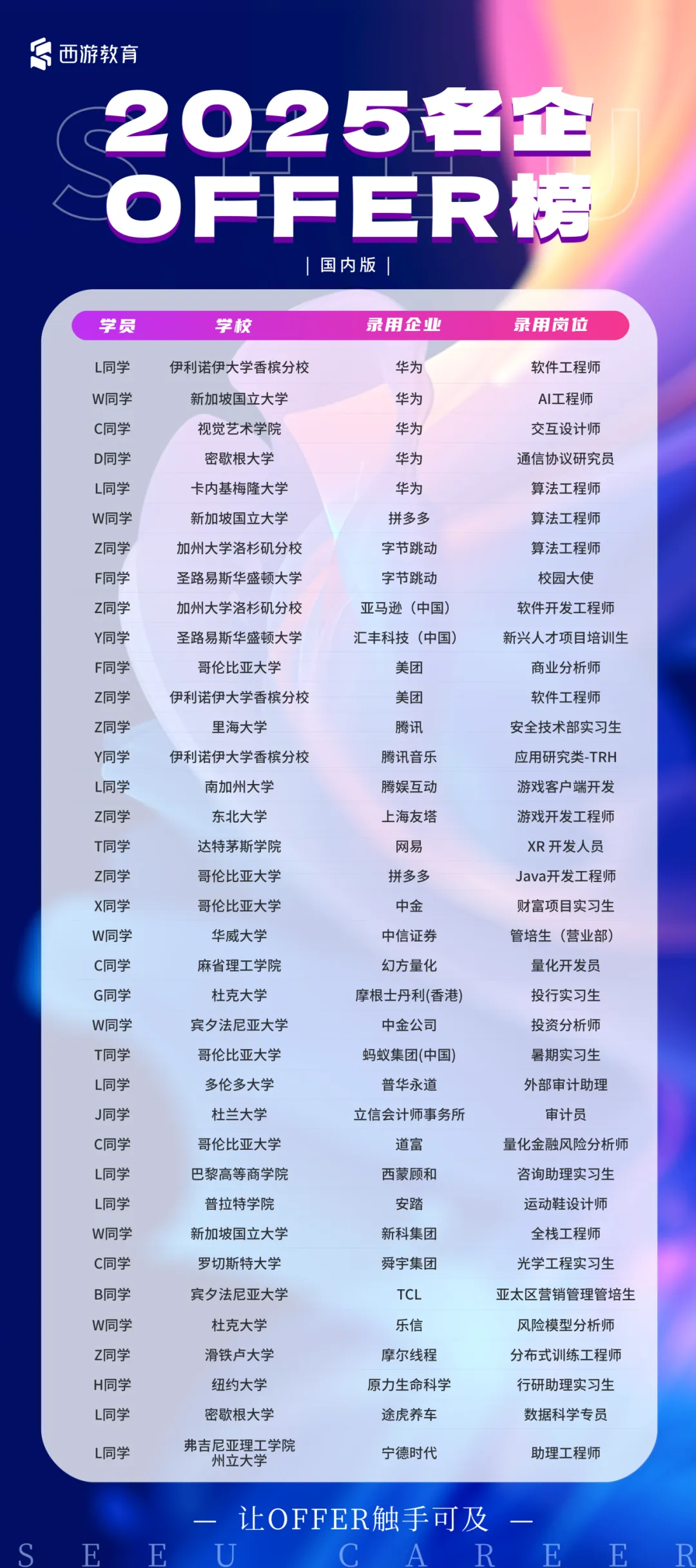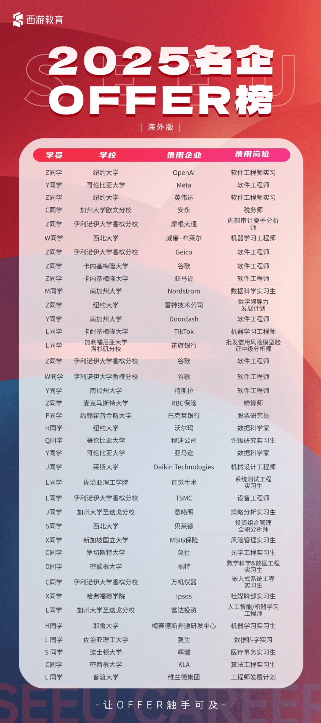 西游教育拥有10年+留学生求职辅导成功经验,帮助学员斩获海内外名企offer,覆盖全行业:科技、金融、咨询、生物医药、制造业、快消零售、艺术等。