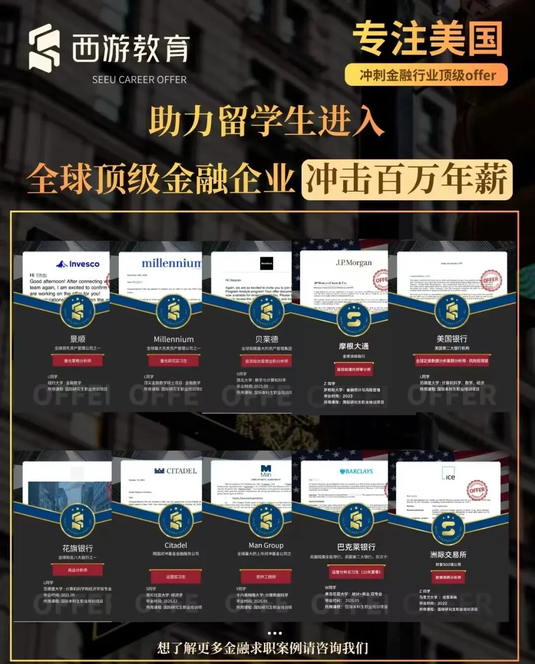 西游教育专注为留学生家庭提供一站式职业规划与求职辅导,深度了解券商、投行、互联网等名企招聘机密。