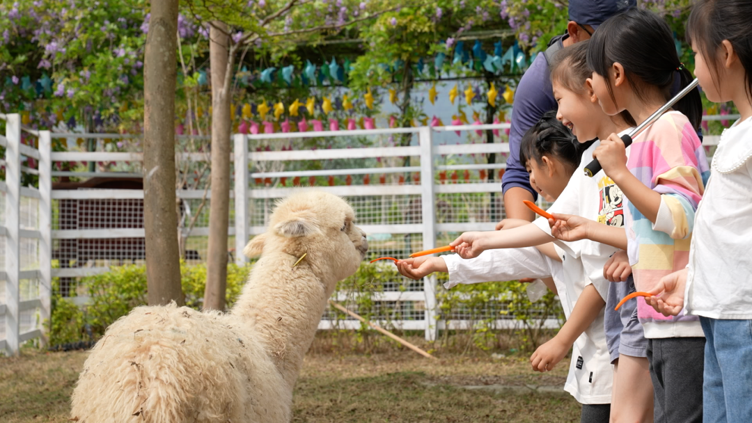 小朋友跟着李教练来到田园牧场,这里就像个小小的动物园,小朋友们要喂羊驼、波尔多羊。