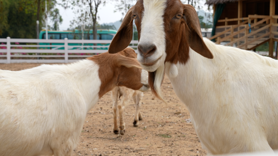 波尔多山羊很喜欢小朋友手中的胡萝卜,侧着脑袋伸出来。