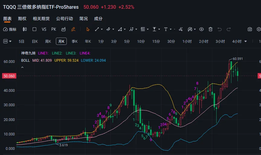 海外券商提供的交易工具十分丰富,除了常规交易,还有杠杆类工具(比如两倍做多、三倍做多),以及期权等各类金融衍生品,能满足不同投资者的策略需求。下图为三倍做多纳斯达克的示例(仅作为科普展示,不构成任何投资建议)。