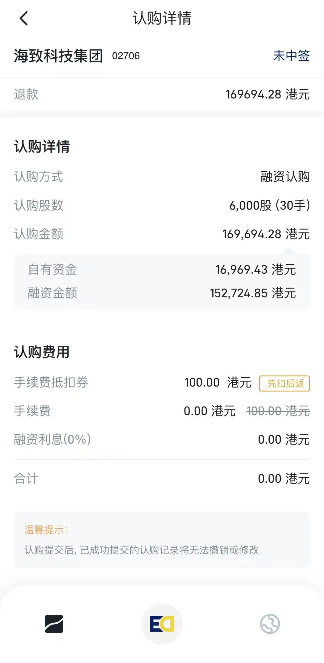 和A股打新不同,港股打新无需持有对应市值的股票,只要有现金就能参与,门槛极低。同时还支持融资打新,最高可放大10倍杠杆——也就是说,你有1万资金,就能当成10万来打新,大大提升中签概率。更友好的是,中签后补齐中签款,无需支付融资利息;若未中签,也不会产生任何融资费用,性价比拉满。具体示例见下图。