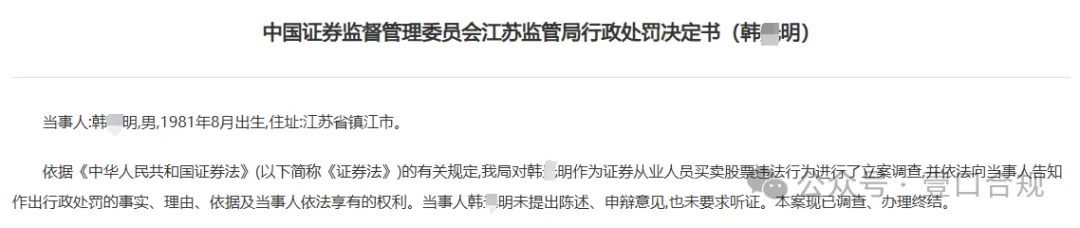 头部券商员工:使用父亲、妻姐账户炒股10年,亏损76万,被罚8万!| 案例2024年第169期处罚一个,警示一批。本文的目的亦在于借助个案起到警示教育的目的,同样希望各位读者立足于此,更多关注案例背后暴露出的合规问题。以案促改,以案促进,共同助力证券从业人员的执业能力提升和证券行业的健康高质量发展。2024年10月28日,江苏证监局发布处罚决定,对某证券营业部工作人员韩某明违法买卖股票行为进行行政处罚。使用父亲、妻姐账户炒股10年,亏损76万,被罚8万当事人:韩某明,男,1981年8月,住址:江苏镇江。2014年7月8日至2021年9月3日,当事人韩某明在YH证券公司南京江东中路营业部任职,先后担任证券经纪人及理财经理。2014年10月10日至2021年4月29日,韩某明先后利用其父亲、妻姐证券账户进行股票交易,合计亏损76.03万元。账户内资金主要来自于韩某明本人及其家庭资金,资金去向主要为韩某明本人或归还其借款。韩某明的上述行为违反《证券法》第四十条第一款的规定。依规,监管部门决定:对韩某明处以8万元的罚款。监管查处多起利用父母、配偶账户炒股案例某种角度上看,借用父母、配偶账户炒股,对于逃避监管打击,做实证据链确实存在一定挑战。尤其是利用配偶账户,从资金端来看,作为夫妻共同财产,很难找到扎实的证据来证明资金来源于从业人员。因此,一些从业人员似乎从中看到了机会与可能,冒险为之。然而,近两年来厦门局、黑龙江局、深圳局、宁波局等多家证监局查处了从业人员利用父母、配偶账户违规炒股的案例,也再次警示各位从业人员:手莫伸,伸手必被捉!1.2024年9月,宁波局发布处罚决定,某证券营业部工作人员黄某,控制使用配偶、母亲、父亲证券账户交易,买卖成交总金额1.23亿元,整体交易亏损89.02万元(已扣除税费)。刘某的上述行为违反《证券法》第四十条第一款的规定。依规,对其处以10万元的罚款。。2.2023年4月,黑龙江局发布行政处罚决定,某证券分支机构总经理季某某,使用配偶证券账户,通过MAC地址为00********87和EC********81的设备买卖股票,累计成交金额1638.21万元,交易整体亏损。依规,责令其依法处理非法持有的股票和其他具有股权性质的证券,并处以5万元罚款。3.2023年1月,深圳局发布行政处罚决定,某证券公司工作人员罗某,使用母亲、配偶账户进行股票买卖,累计成交金额3631.07万元,亏损5.29万元。依规,对其处以6万元罚款。4.2022年12月,深圳局发布行政处罚决定,某证券营业部理财顾问王某某,控制使用母亲、配偶证券账户买卖股票,累计成交金额24,874,519.3元,亏损220,412.01元。依规,对其处以5万元罚款5.2022年11月,深圳局发布行政处罚决定,某证券营业部投资顾问黎某某,控制使用配偶、其父、其母证券账户交易股票,总成交金额合计1832.45万元,盈利10.07万元。依规,没收其违法所得10.07万元,并处以10万元罚款。6.2022年7月,宁波局发布行政处罚决定,某证券公司保荐代表人金某某,通过朋友李某原买入股票10.5万股,获利104.91万元。按照金某某的指示,李某原将上述本金及获利共计235万元转入金某某配偶王某ZS银行账户。同月,王某将收到的款项转给金某某。依规,没收其违法所得104.91万元,并处以100万元罚款。7.2022年6月,厦门局发布行政处罚决定,某证券营业部客户经理柳某某,操作配偶证券账户买卖股票262笔,累计交易金额910.6万元,交易整体亏损。依规,责令其依法处理非法持有的股票,并处以3万元罚款。免责声明:本文系个人整理,如有出入,请咨询专业机构并查询相关法律法规及监管部门意见,本人不承担任何责任。关注公众号可了解更多案例分析和规则解读!获取2020-2025年处罚材料、商务合作、信息共享、入群、投稿、转载可扫码添加作者!知识星球《壹口合规》已正式开通,加入后可获取海量资料: