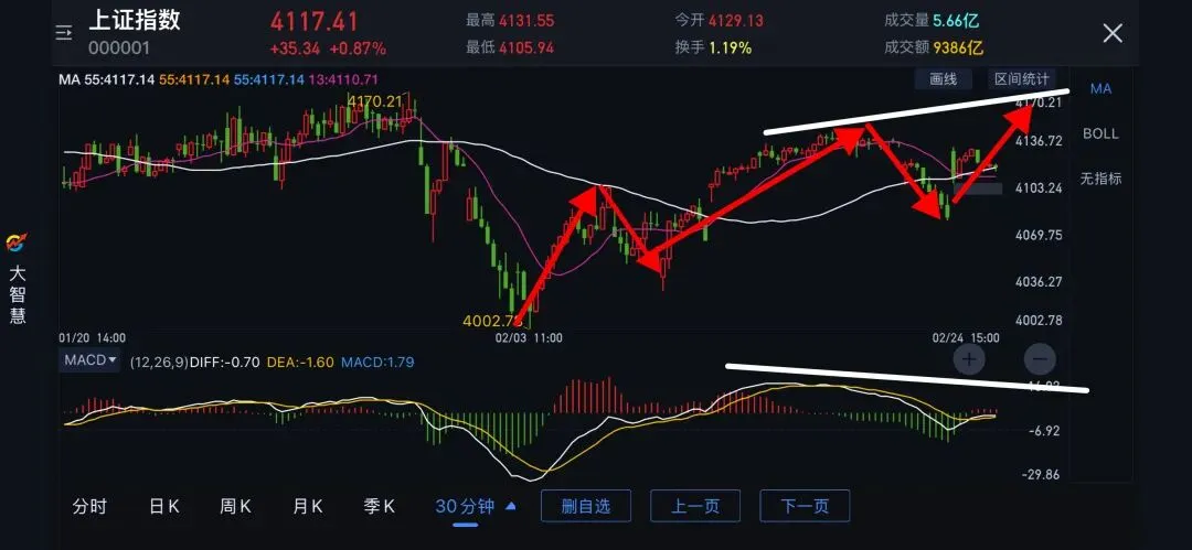 20260224上证指数分析+券商指数跟踪节后第一天,走势没有出现大的变化。日线图依然是区间震荡,尚无要突破的迹象。30分钟图有小5浪的迹象。如果过4浪顶,即出5浪,会有顶背离钝化。耐心观察吧。券商120分钟图即将底背离钝化,耐心等底背离结构形成。祝大家交易成功🏆