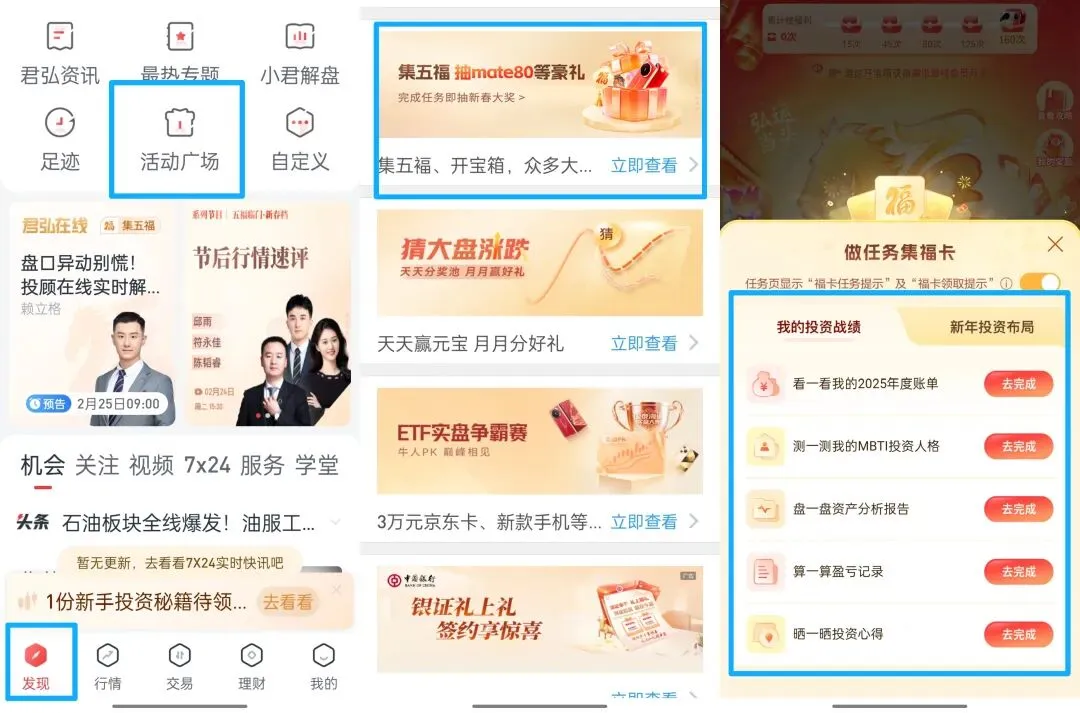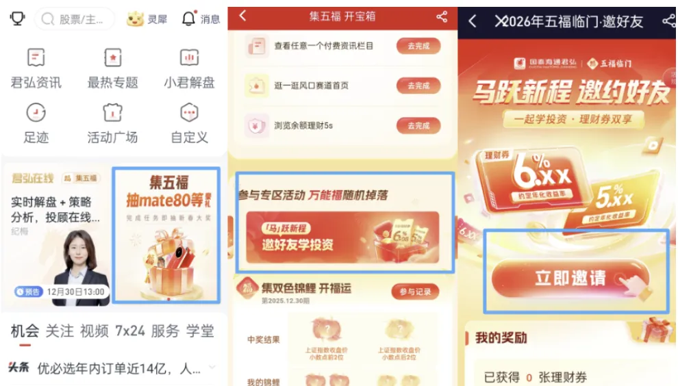 靠“薅羊毛”攒下几千块?券商理财券入门攻略很多人问我,理财新手怎么开始?我的回答常常是:从“薅羊毛”开始,体验赚钱的快乐。去年,我跟着国泰君安的活动,陆陆续续也攒下了几千块。它家的活动设计得很实在,不用复杂的操作,新老用户都能参与,收益明确,像年底这波“集五福”和“新春抽福卡”就是很好的例子。