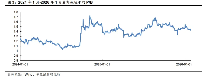 2026年1月券商板块的平均P/B最高为1.541倍,最低为1.426倍,P/B震荡区间的上限及下限环比同步提高,最高曾一度超越2016年以来1.52倍的板块平均P/B,但下半月后再度回落至1.40倍P/B上方。截至2026年1月30日收盘,券商板块的平均P/B为1.426倍。